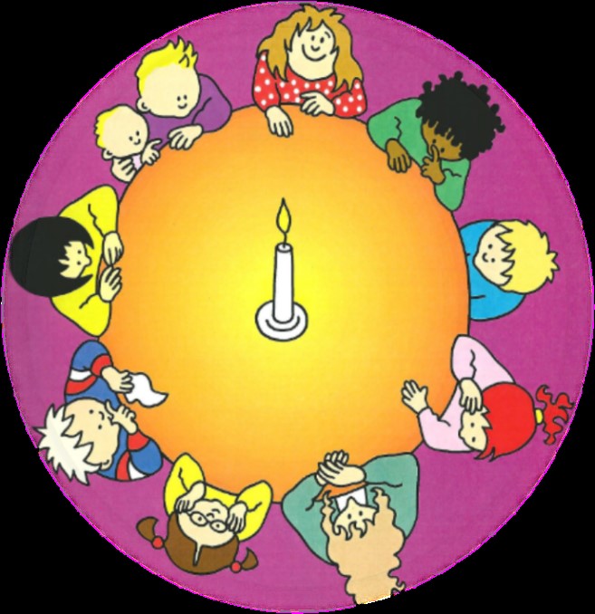 Met kussens in de kring, de Kind-Op-Schoot-kaars aan,